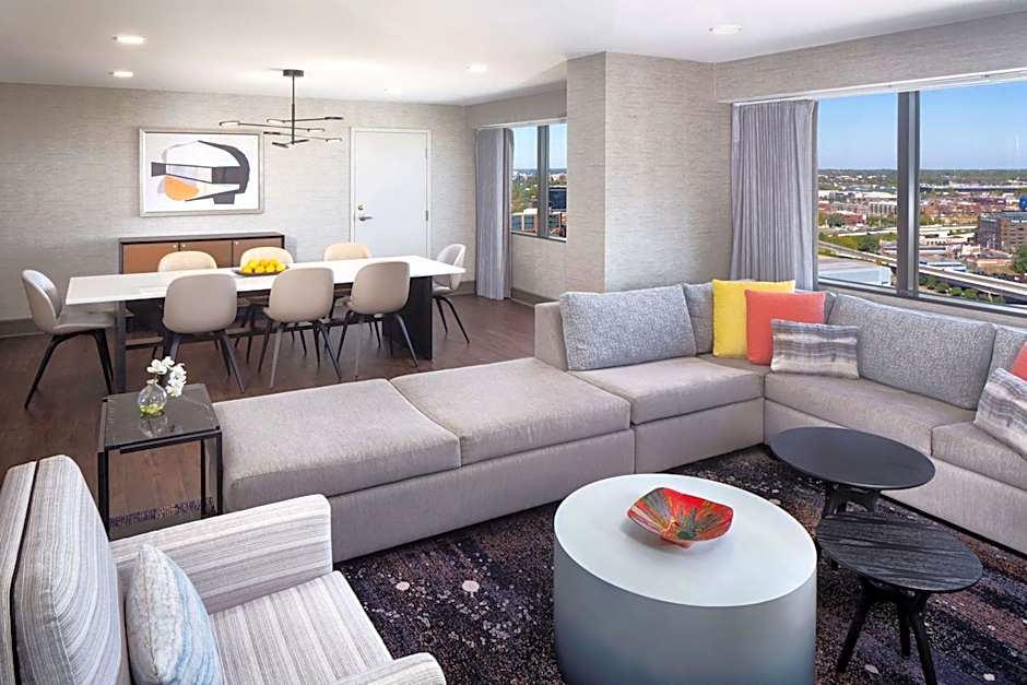 This room features a coffee machine and cable TV. A seating area and working desk are also included. For convenience, a coffee/tea maker and mini-refrigerator are provided. Views of the city and Nationwide Arena are presented.